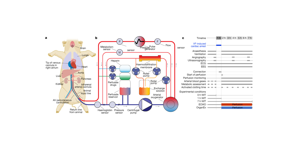 Imagen 2 : Descripción general de la tecnología OrganEx y el flujo de trabajo experimental. a, Conexión del cuerpo porcino al sistema de perfusión OrganEx (o ECMO, no se muestra) a través de la canulación de la arteria y la vena femorales. b, Esquema simplificado del dispositivo de perfusión OrganEx. El sistema está equipado con bomba centrífuga, generador de pulsos, hemodiafiltración, infusión de gases, sistemas de administración de fármacos y sensores para medir parámetros metabólicos y circulatorios. c, Esquema del flujo de trabajo y las condiciones experimentales. FV, fibrilación ventricular.Fuente: Cellular recovery after prolonged warm ischaemia of the whole body. Nature 608