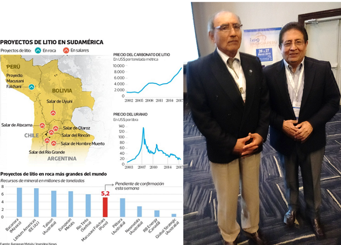 Recientemente ejecutivos de la canadiense Plateau Energy Metals anunciaron que la Mina Falchani (Perú), posee “Litio en roca” encontrándose con contenido siete veces superior al de los salares, entre los 3500 a 4000 ppm (partes por millón), teniendo reservas de aproximadamente 2.5 millones de toneladas y estimándose que se duplicara esa medida para fin de año con los resultados de vla perforaciones tipo sondaje que se efectúan actualmente
