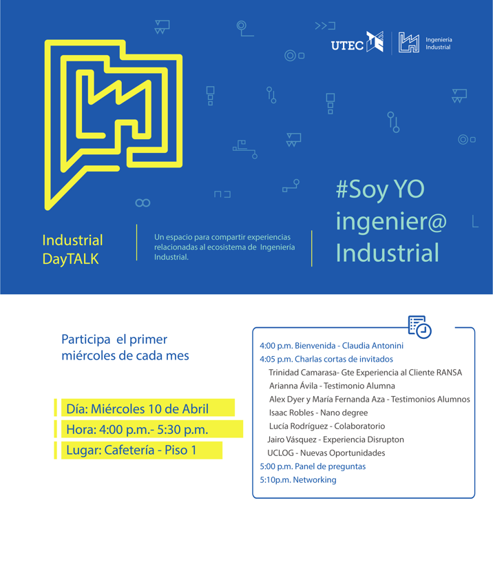 Industrial Day es una actividad que realizamos con todos los estudiantes de Ingeniería Industrial para que entiendan de qué se trata ser un ingeniero industrial, fomentarles el sentido de pertenencia y el orgullo por la carrera. Hoy miércoles 10 de Abril a las 4pm conversaremos con profesionales de Ingeniería Industrial, en un evento para compartir la experiencia de esta disciplina en diferentes rubros. Tendremos presentaciones rápidas seguido por networking. ¡Los esperamos!