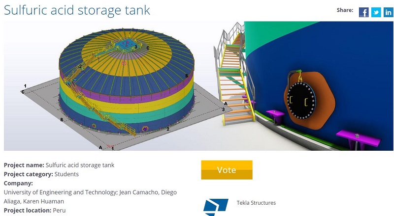 https://www.tekla.com/bim-awards/sulfuric-acid-storage-tank aqui le dejo el link del proyecto para votar, ya que se encuentran en la shortlist en la competencia mundial.
