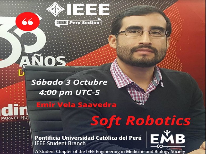 Los invitamos a participar en la ponencia acerca de “Robótica blanda para ingeniería biomédica", que será dictada por Ph.D Emir Vela Saavedra profesor del departamento de Ingeniería Mecánica. El Dr. Vela cuenta con los siguientes grados académicos: BSc MSc en Micro-ingeniería de l'École Polytechnique Fédérale de Lausanne - EPFL, Suiza; PhD en Robótica de l'Université Pierre et Marie Curie/CNRS - Paris VI, Francia.