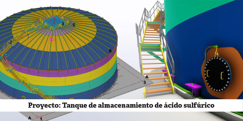 Este proyecto consiste en un tanque de almacenamiento de ácido sulfúrico, que cuenta con un diámetro exterior de 28.050 m y con una altura de 13.050 m. Este tanque está compuesto por: el piso, el casco, el techo o domo, boquillas con bridas, tuberías de venteo, manhole de techo, manhole de casco, escaleras, plataforma, barandas y silletas de anclaje. Todo el modelo fue realizado en el software Tekla Structures, a excepción de los manholes ya que se modelaron en otro software y se integraron al modelo general mediante el uso del IFC.
