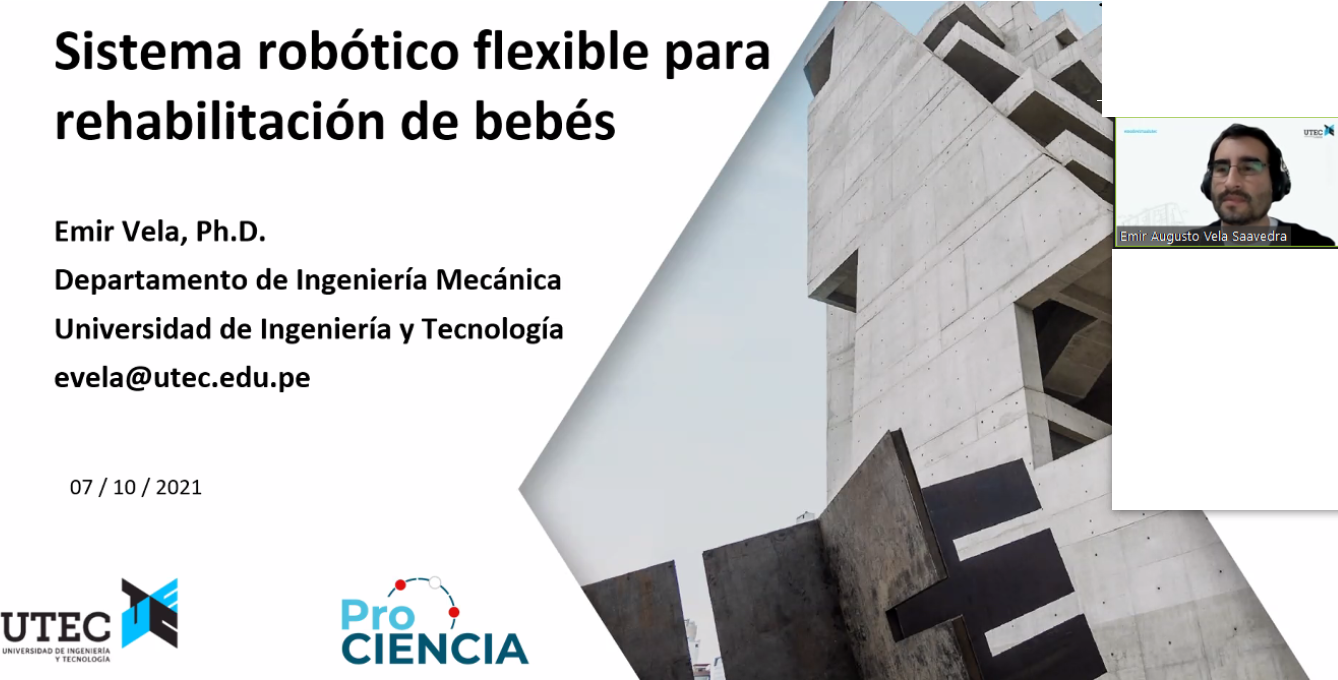 El 7 de octubre del 2021 el Dr. Emir Vela, profesor del Departamento de Ingeniería Mecánica, por invitación del capítulo estudiantil de la IEEE EMBS PUCP, brindó la charla sobre el exoesqueleto robótico altamente flexible para rehabilitación de bebés con espina bífida que viene desarrollando con financiamiento de ProCiencia. Además, enfatizó sobre el diseño de músculos artificiales utilizados en Soft Robotics que vienen siendo desarrollados por la comunidad científica internacional, y presentando así el músculo artificial accionado con presión de vacío desarrollado en su laboratorio el UTEC MaBLab que será implementado en el exoesqueleto robótico flexible. Este proyecto es en colaboración con el MIT, la UNT y el INSN SB.