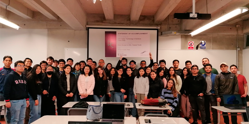 Un grupo de 37 estudiantes dentro del curso Tecnologías de Información en los Servicios, electivo de la Carrera de Ingeniería Industrial dictado por el profesor Juan Carlos Bueno Villanueva, concluyeron exitosamente el Track Data Analyst in SQL, compuesto por 11 cursos y 1 Proyecto que les permitió desarrollar habilidades en el lenguaje de consultas de bases de datos SQL, para obtener información oportuna en la toma de decisiones a nivel empresarial. El hecho de que se haya realizado dentro del curso, permitió el aprendizaje con pares en comunidad así como con el profesor Juan Carlos Bueno afianzando lo aprendido.
