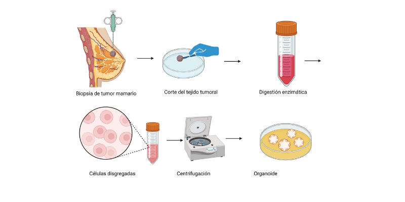 1)Corte del tejido, 2) Digestión enzimática 3) Separación celular 4)Suspensión en Matrigel u otra matriz y aplicación de medio de crecimiento.