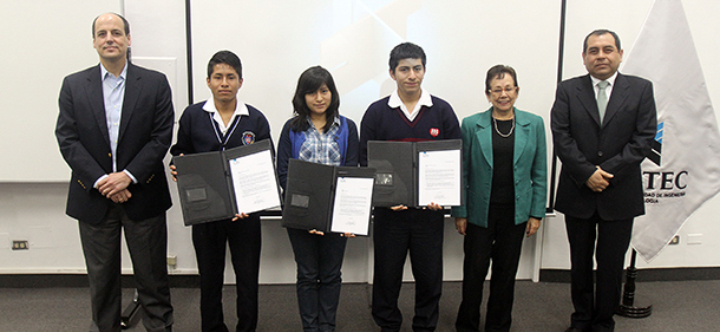Un futuro prometedor se inicia para Vania López Florida, Junior Alberto Tahua Ardián y Sandro Raúl Huamaní Pizarro. Todos ellos destacados estudiantes en el Colegio Fe y Alegría, quienes recibieron becas de estudio en Ingeniería Industrial y Mecánica de manos de Carlos Heeren, Director General, y Alberto Bejarano, Director General Académico, el pasado 8 de setiembre en las instalaciones de UTEC Santa Anita.