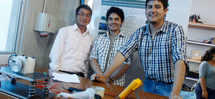 José Magallanes, Christian Monterrey y Frank Salazar de Ingeniería Electrónica y Juan Toribio de Ingeniería Mecánica estudiantes de pregrado, supervisados por el Dr. Emir Vela, ganaron el premio al mejor proyecto este 2014 II, y recibieron de manos de Pablo Moreno, Coordinador de Calidad e Innovación Educativa, y Verónica Lunga, Coordinadora de Servicios Estudiantiles, esta distinción. Ambos tuvieron palabras de elogio al esfuerzo y el trabajo de estos estudiantes, que representan lo mejor del ingenio que caracteriza a los estudiantes de la Universidad de Ingeniería y Tecnología (UTEC).