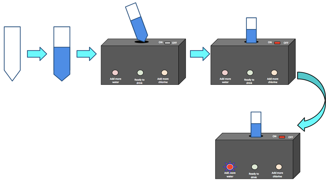 Explicación Técnica: El cloro en el agua se hace reaccionar con un indicador, sustancia que da una coloración al agua. Esta coloración puede medirse por medio de un fotodetector, el cual está programado para dar colores rojo, amarillo y verde en caso de que el agua esté con demasiado cloro, con una deficiencia de cloro o en el rango exacto para ser bebida.