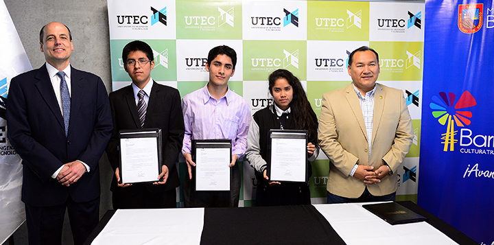 Continuando con la apuesta por el talento peruano y en el marco del convenio suscrito con la Municipalidad Distrital de Barranco, la Universidad de Ingeniería y Tecnología (UTEC), hizo entrega de 3 becas de estudio a alumnos de instituciones públicas del distrito en mención. La ceremonia realizada en el campus de UTEC contó con la presencia del Alcalde del distrito, Antonio Mezarina; del Director Ejecutivo de UTEC, Carlos Heeren; autoridades de los colegios; alumnos becados y sus familiares.