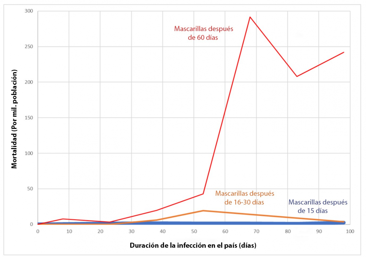 Figura 1. Mortalidad según se haya adoptado el uso de mascarillas versus duración de la infección. Datos: Si se recomendó su uso 60 días después del inicio del brote (línea roja); mascarillas recomendadas de 16 a 30 días después del inicio del brote del país (línea naranja); o mascarillas recomendadas (o mascarillas utilizadas tradicionalmente) dentro de los 15 días posteriores al inicio del brote (línea azul cerca del eje x).