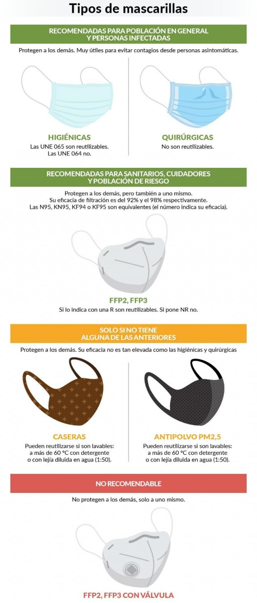 Entre las mascarillas que puedes usar para protegerte del nuevo coronavirus están los respiradores FFP2 (N95), la FFP3 (N99), mascarillas quirúrgicas o las mascarillas reusables de tela. Las primeras 3 reservadas principalmente para el uso de personas expuestas a una posible alta carga viral y la última designada para el uso comunitario (4).