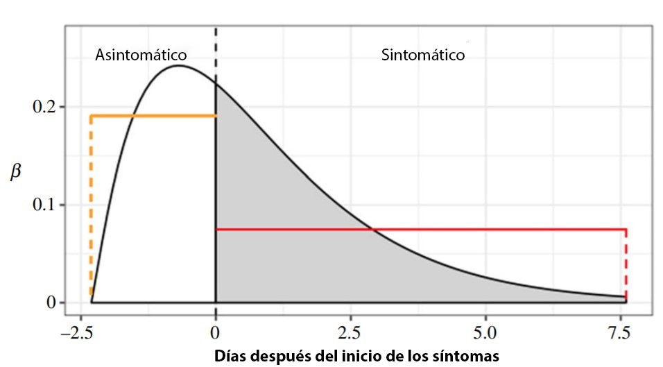 Figura 2. Distribución de la capacidad infecciosa de individuos asintomática y sintomática infectados con COVID-19. Las líneas horizontales muestran el promedio capacidad de infección por unidad de tiempo para la etapa asintomática (naranja) y la etapa sintomática (rojo). Siendo la etapa asintomática, en especial antes de los dos días de presentar síntomas donde el individuo es capaz de contagiar más que cuando ya se presenta síntomas.