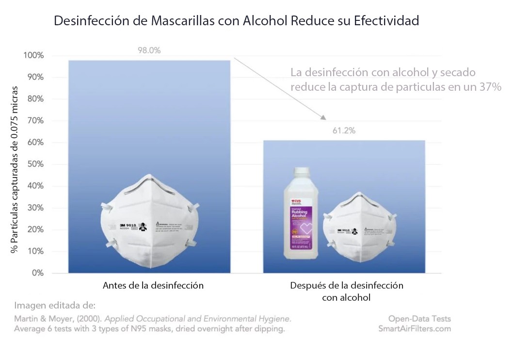 Figura 2: La desinfección de las mascarillas usando alcohol reduce la capacidad de estas para capturar partículas por lo que no debería usarse como método de desinfección primario.
