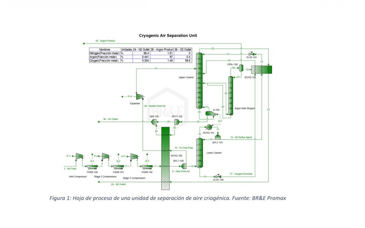Se suele producir mediante plantas de oxígeno que operan unidades de separación de aire (ASU, air separation units) mediante destilación a muy bajas temperaturas. El aire se somete a etapas de remoción de impurezas, compresión, expansión y enfriamiento a fin de alcanzar temperaturas lo suficientemente bajas como para que el nitrógeno (P. eb = -195.8°C) pueda separarse como vapor y el oxígeno (P. eb = -183°C) como líquido en una columna de destilación criogénica. El nitrógeno es típicamente purgado, mientras que el oxígeno líquido producido se almacena y se le gasifica nuevamente, según sea necesario. Estos procesos pueden ser diseñados y optimizados por computador, como se aprecia en la figura 1.